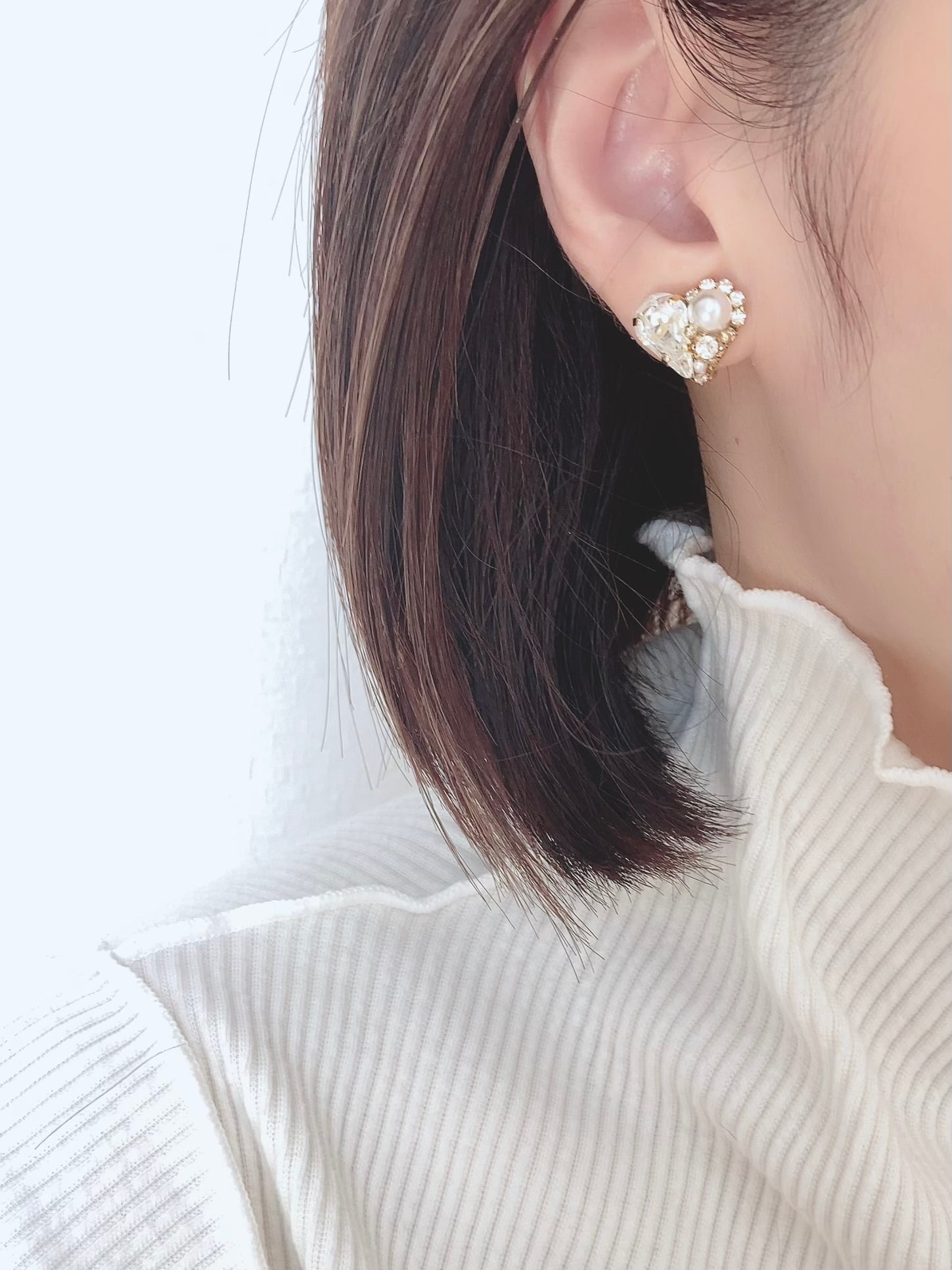 ※こちらはご注文頂いてから制作いたします 透明感のあるクリスタルが、夏の空気にふわりと馴染む耳飾りです。 太陽の光を受けて、そっときらめくクリスタル。 その透明感は、忙しい日常の中で「ほっとひと息」つけるような癒しをくれます。 ✔ ころんと可愛い、大人のハートモチーフ 甘すぎず、どこか凛とした雰囲気。大人の女性に似合う、シンプルで上品なデザインです。 ✔ 涼やかにきらめく、クリスタルの透明感 夏の空や水辺を映したような、清らかな輝き。カジュアルにもきれいめにも馴染む万能さが魅力。 ✔ さりげなく添えた、パールの艶めき 優しい艶感が、耳元に落ち着きと華やぎをプラス。お出かけにもお仕事にも使える一品です。 ⸻ こんなシーンにおすすめ ・家族との夏の思い出作りに ・カフェで過ごす、ちょっと特別な自分時間に ・日焼けした肌にも映える、涼やかなアクセントとして ・冷房でくすみがちな顔まわりに、パッと明るさを添えたいときに ⸻ 自分へのご褒美にも、夏の贈り物にも ハートモチーフには「想いを届ける」意味も。 がんばっている自分へのご褒美に、大切な人へのギフトにもおすすめです。 ⸻ 特別な日も、何気ない日も、ふわりと心をときめかせるアクセサリーを ーサイズー 約1.5cm ー素材ー スワロフスキー ダイヤレーン 真鍮 レジン 耳飾りとネックレスのセットはこちら↓ https://clam2022.base.shop/items/84837636 ネックレスはこちら↓ https://clam2022.base.shop/items/84837608 ハートシリーズ♡↓ https://clam2022.base.shop/blog/2023/10/23/124808 ◇こちらは受注制作です。制作から発送まで一人で行っていますので発送まで10日ほどいただいております。 ◇購入時に、必ずピアスかイヤリングをお選びください。選択なしの場合はサージカルステンレスピアスでお作りします。 ・サージカルステンレスピアス ・サージカルステンレスネジバネイヤリング ・サージカルステンレス蝶バネイヤリング ・ニッケルフリーソフトフィットクリップイヤリング ◇アレルギー非対応パーツには、変色防止コーティング(ジュエリープロテクト)とアレルギー防止コーチング(スウェットバリア)を塗布しております。 ◇ギフトをお選びいただいた場合、一つの商品ごとに対応いたします。 2点以上ご購入で一つのギフトにされたい方は2重にギフトを選ばないようご注意ください。 その他のご要望は、備考欄にご入力ください。