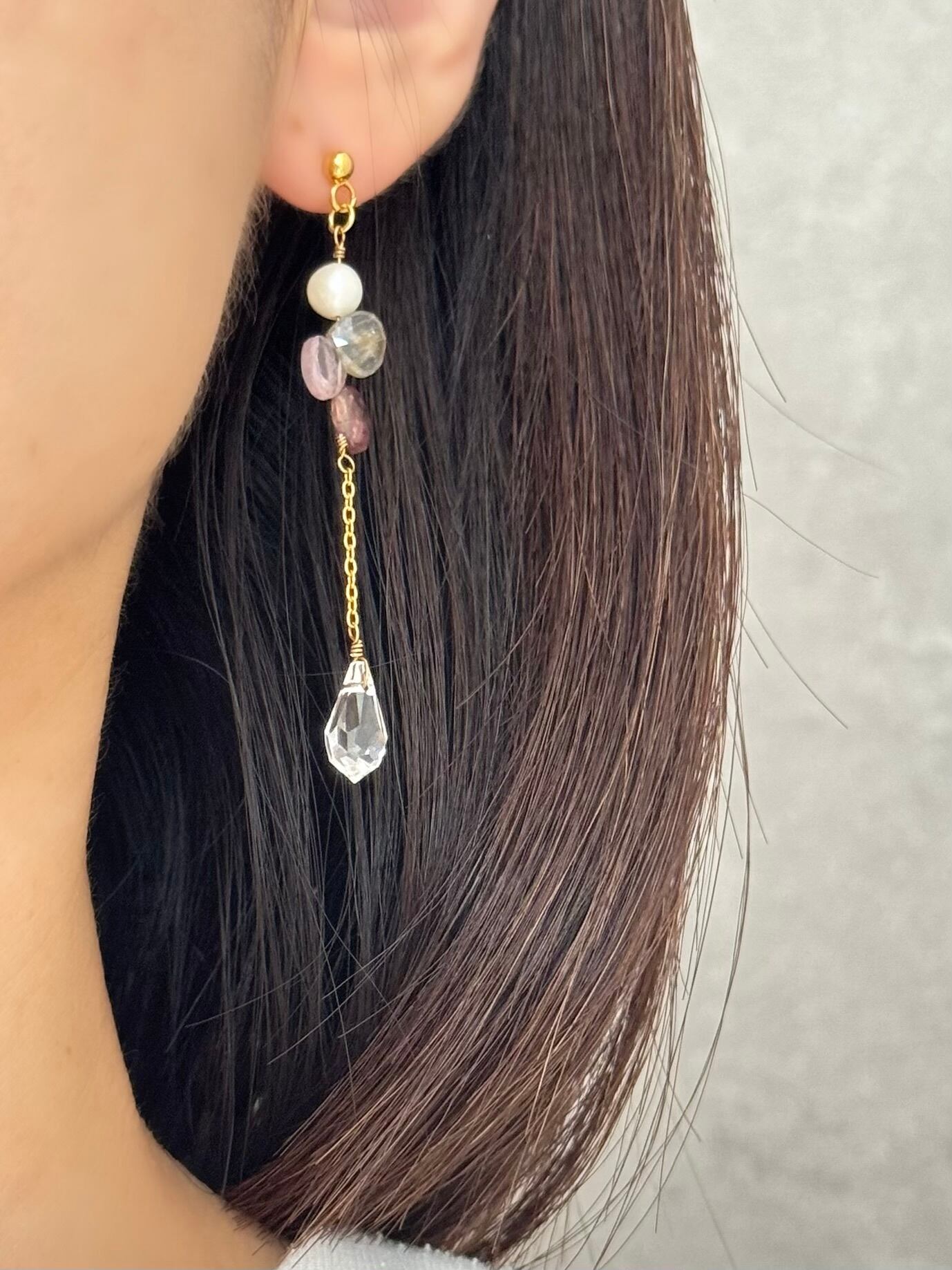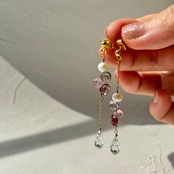 耳元の揺れるデザインは、歩くたび・光を受けるたびにきらめきを増し、ネックレスの穏やかな彩りと響き合います。
