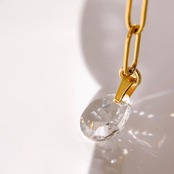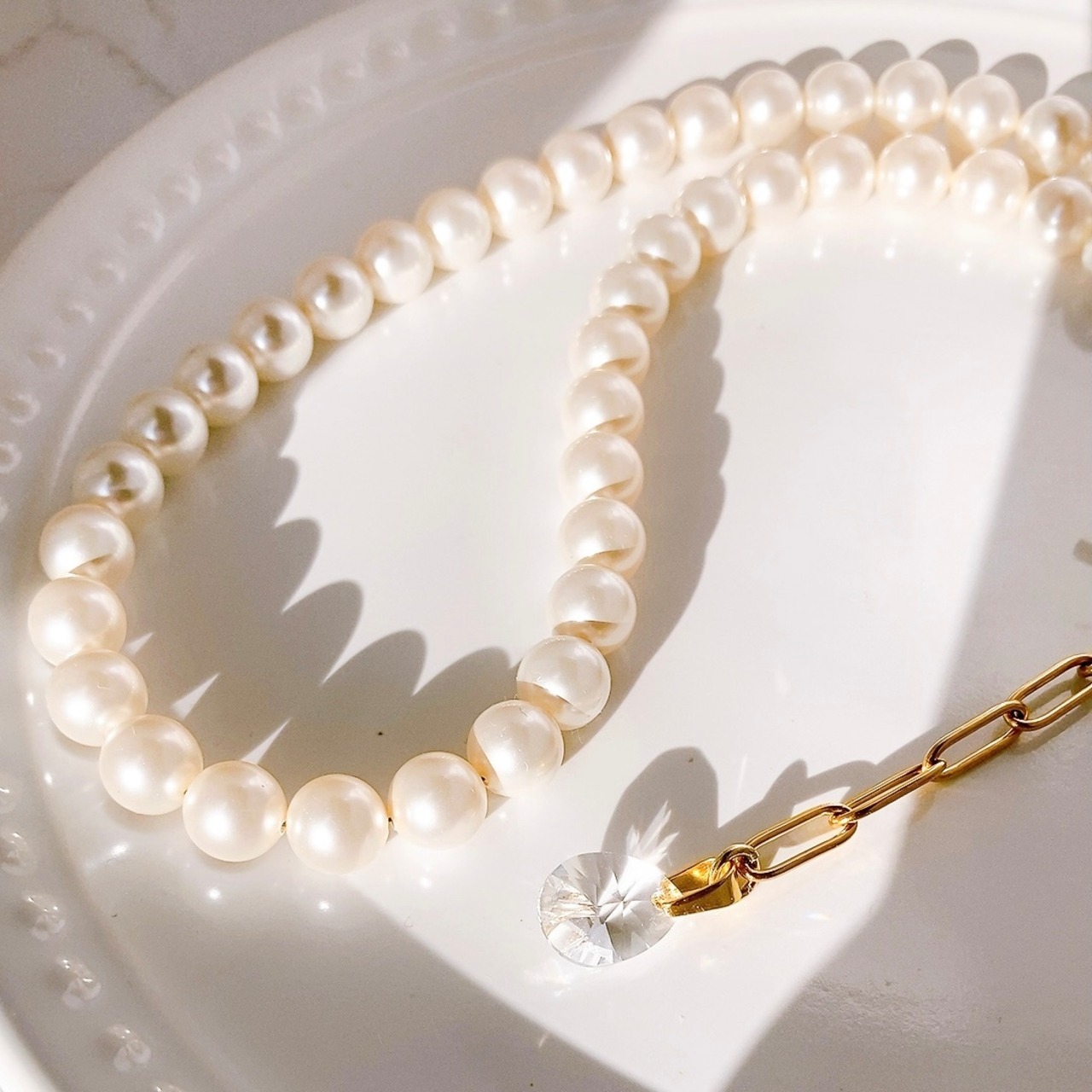 世界的に有名なスワロフスキー社のクリスタルパールを使用。天然貝の粉末を4回塗り重ねた重厚な光沢があり、ガラスパール特有の重みが体にストンと馴染みます。
