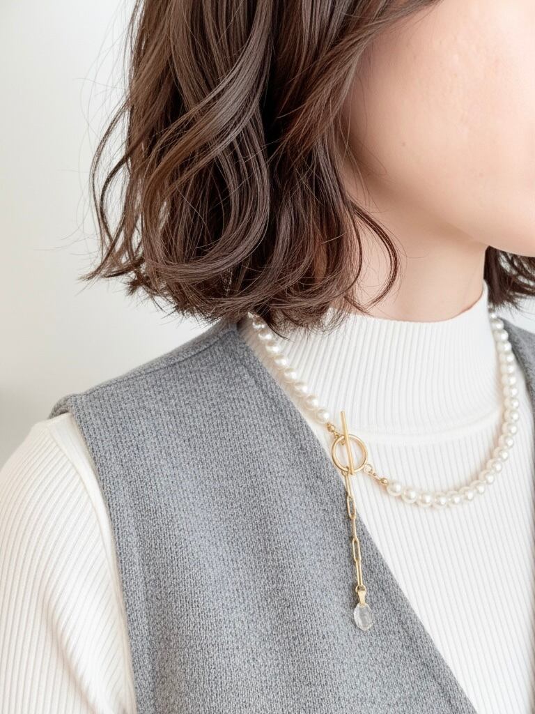 耳元にボリュームがある分、胸元は「引き算」の美学ですっきりと。全体を品よくまとめ、大人にふさわしいバランスに仕上げました。