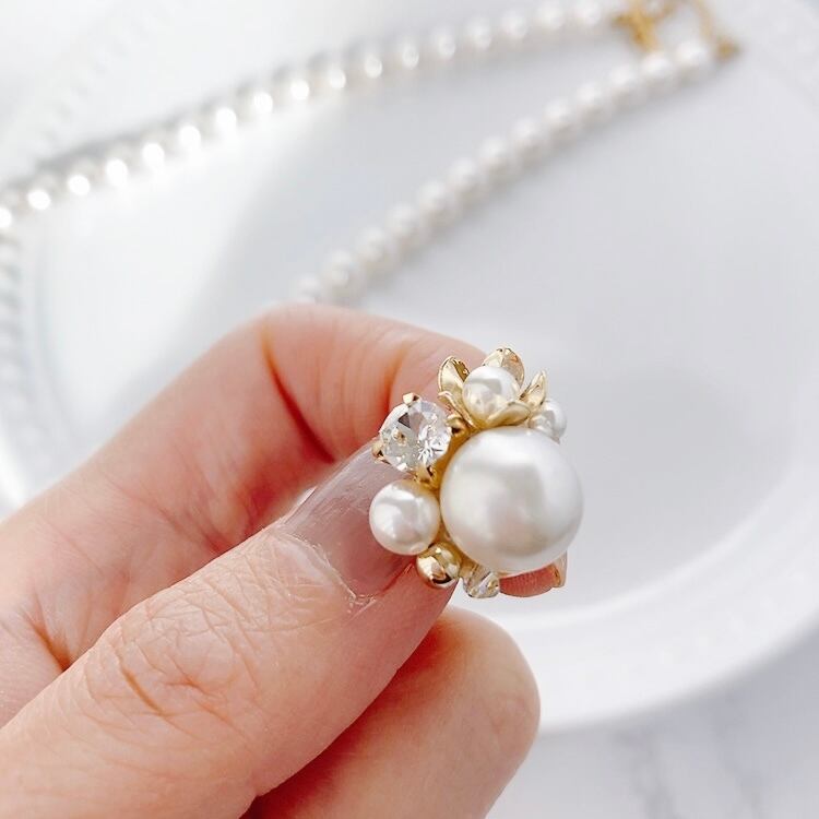 耳飾りには、ひと目で「上質」とわかる大粒のスワロフスキー・クリスタルパール10mmを使用しました。