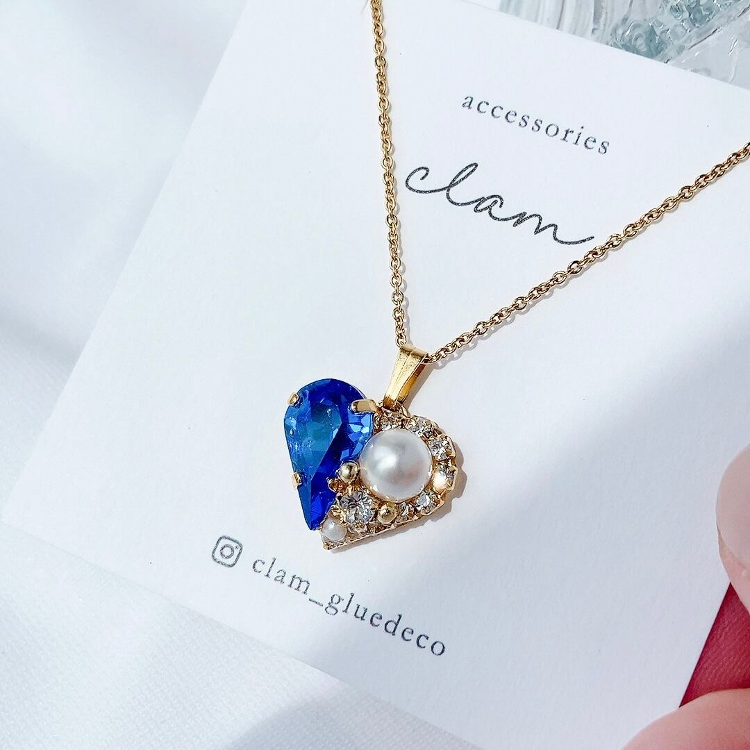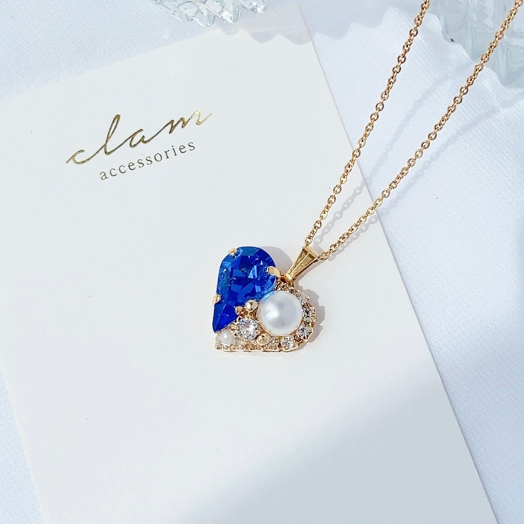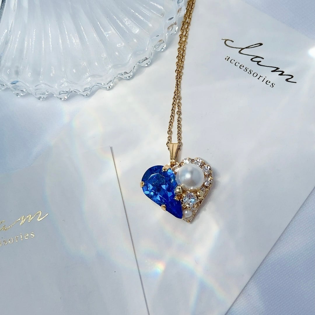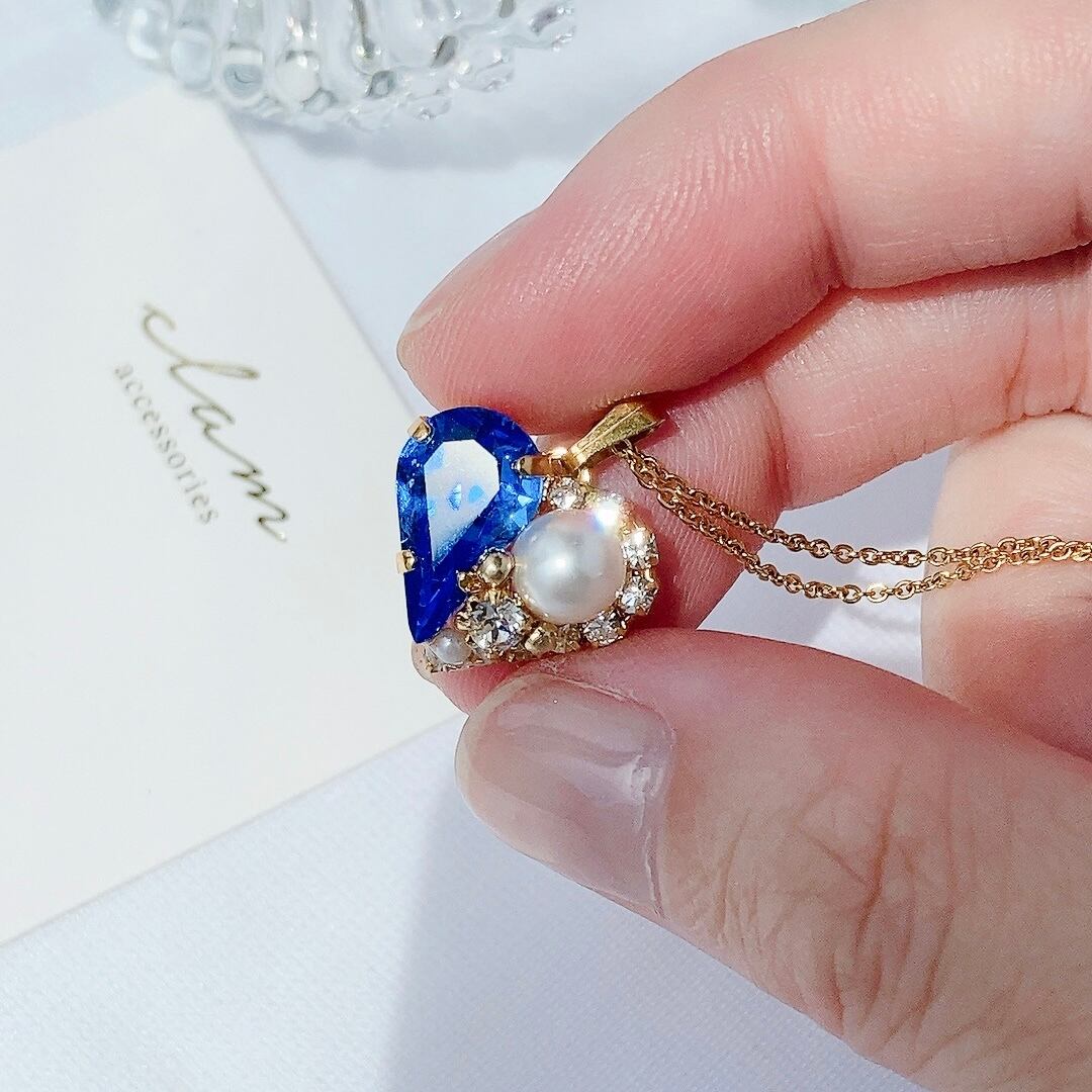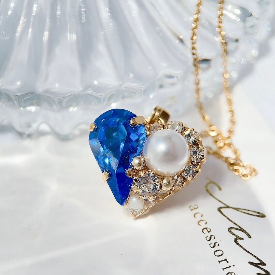サファイアブルーのスワロフスキーとクリスタルパールの可愛らしいハートモチーフ❤️