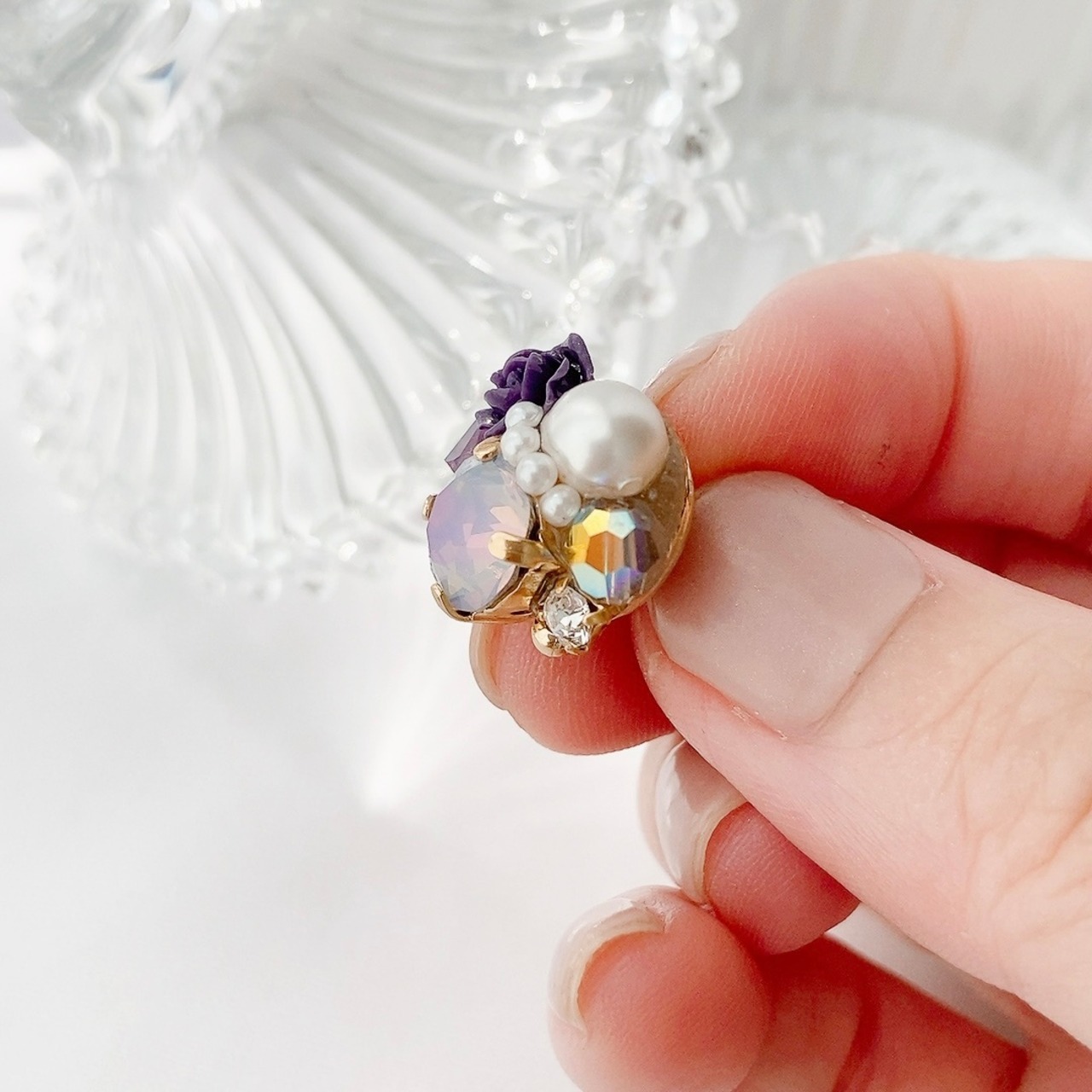◇エポキシ樹脂粘土に小さなスワロフスキー®︎クリスタルを埋めていく「グルーデコ」という技法でお作りしています。