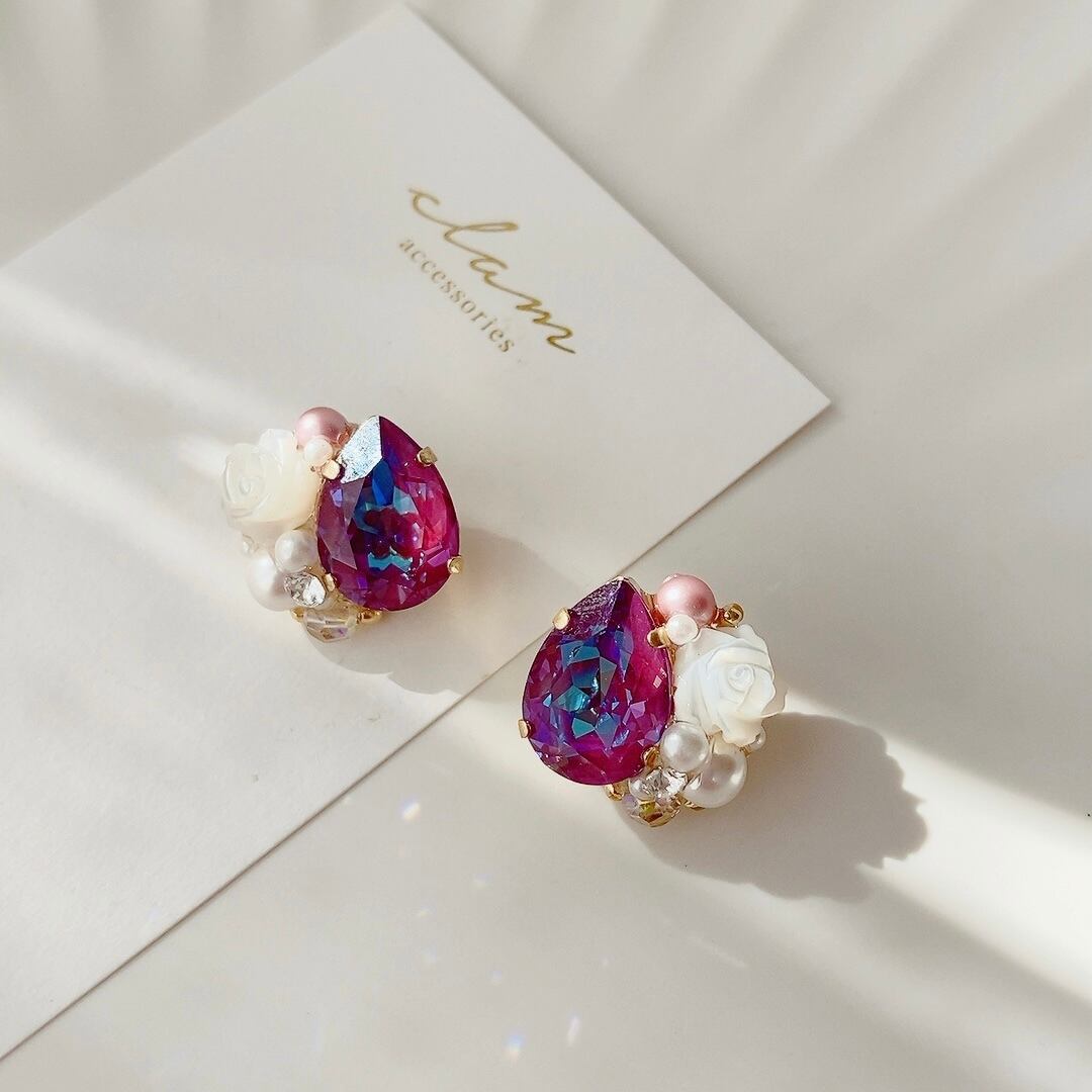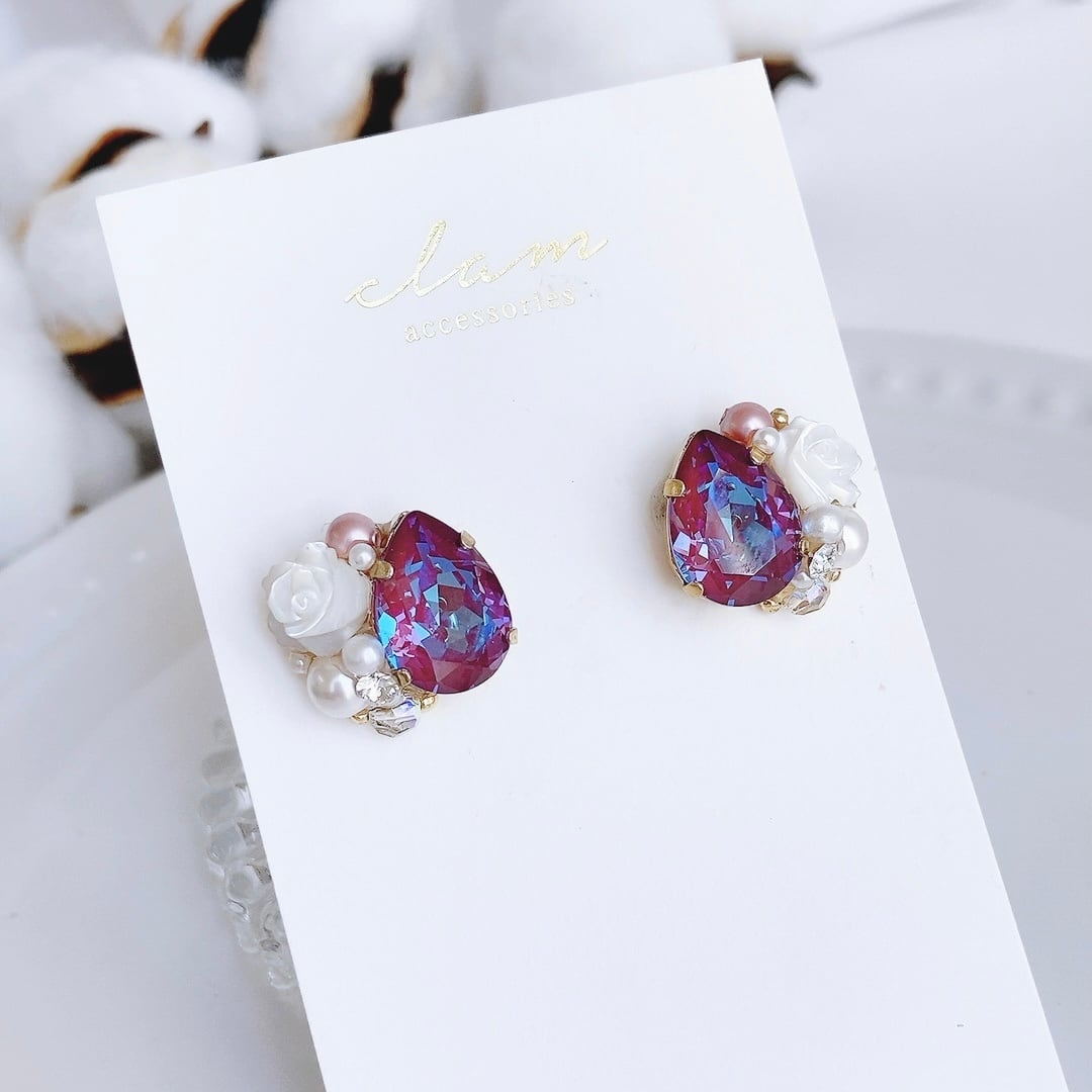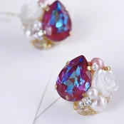 【バーガンディ】スワロフスキーと薔薇のピアス/イヤリング