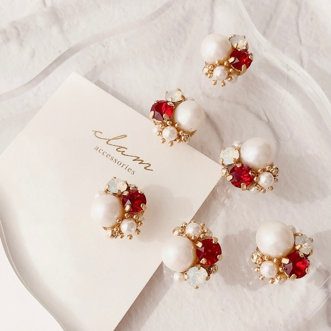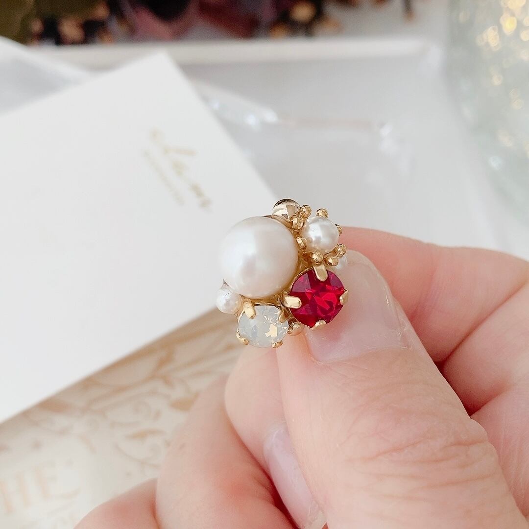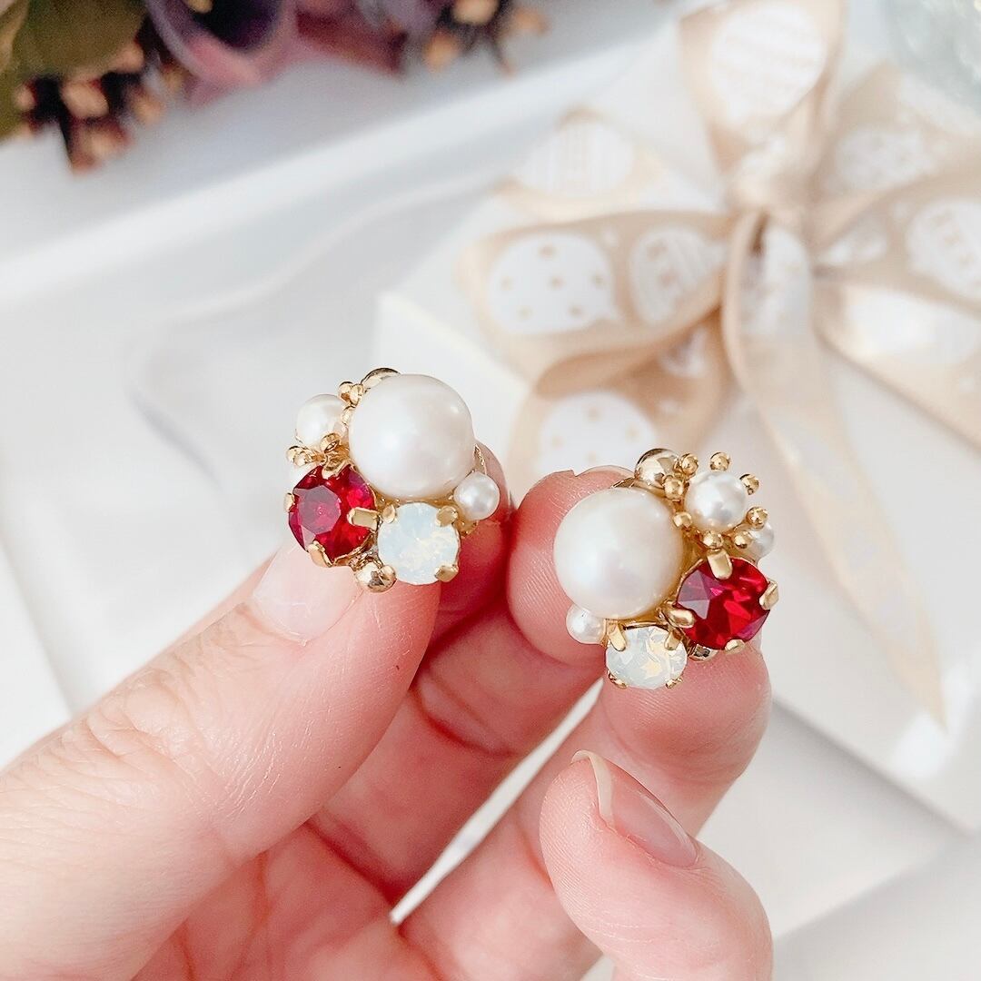 【レッド】スワロフスキーと淡水パールのピアス/イヤリング スワロフスキー