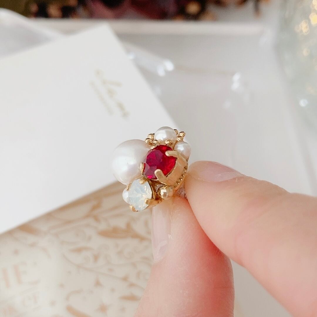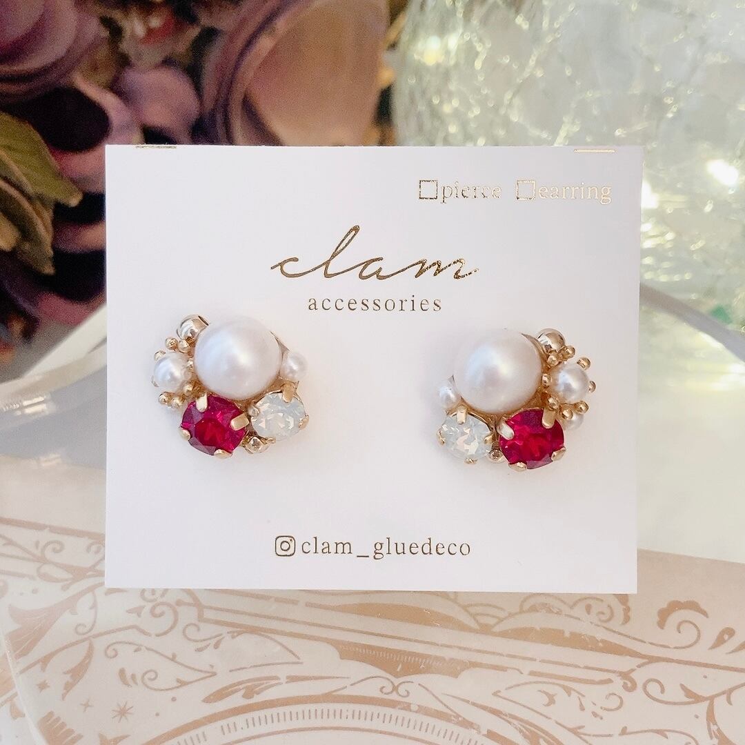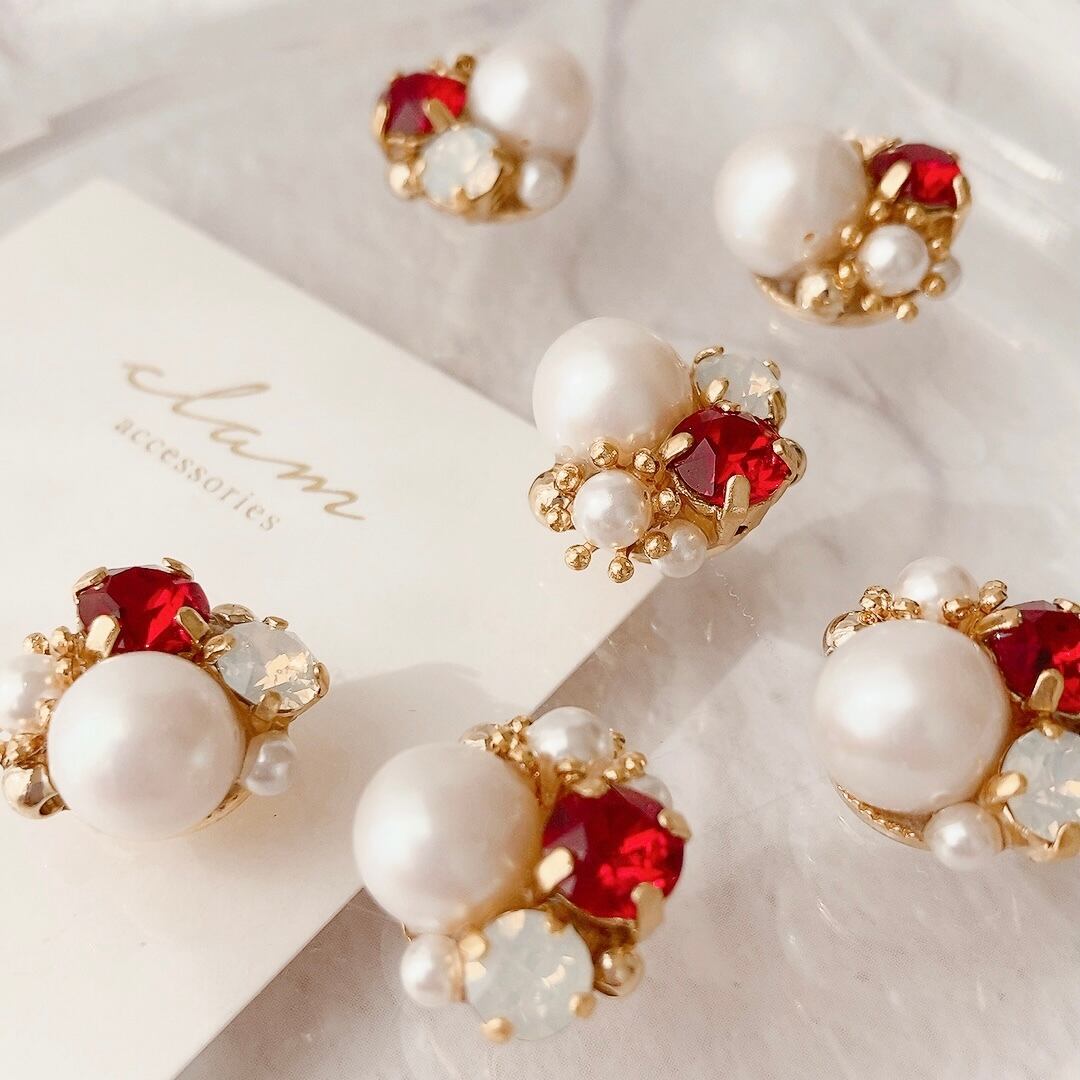 【レッド】スワロフスキーと淡水パールのピアス/イヤリング スワロフスキー