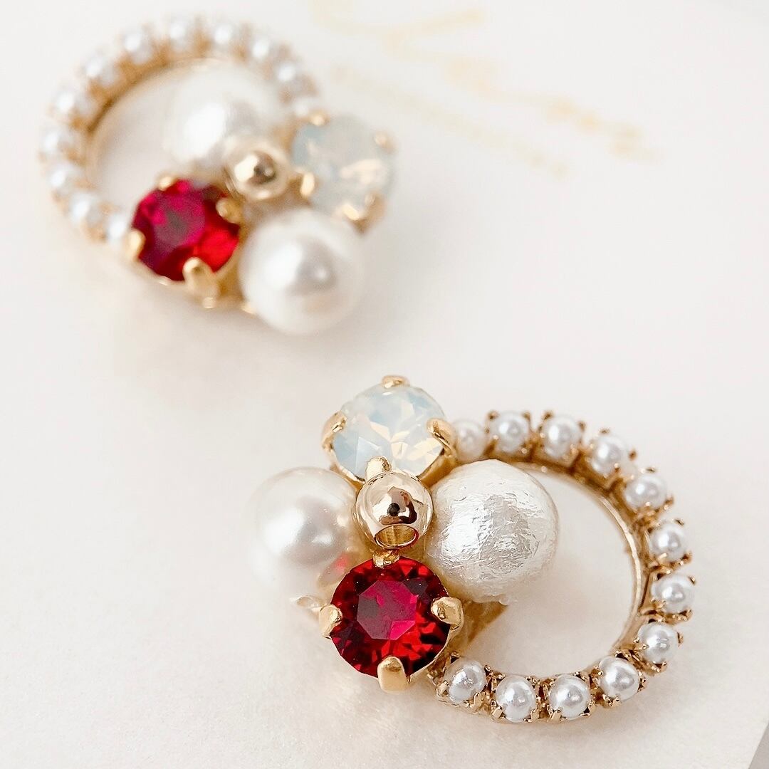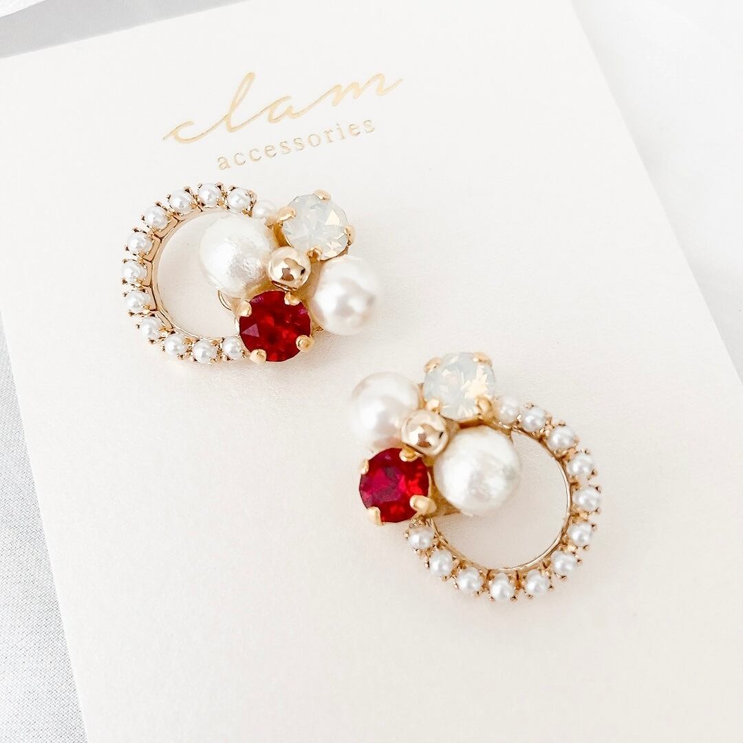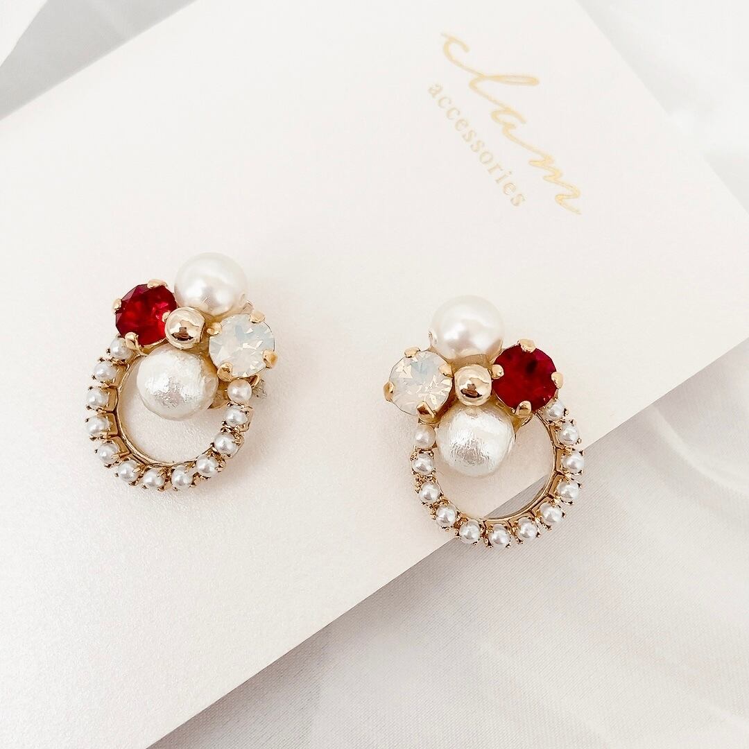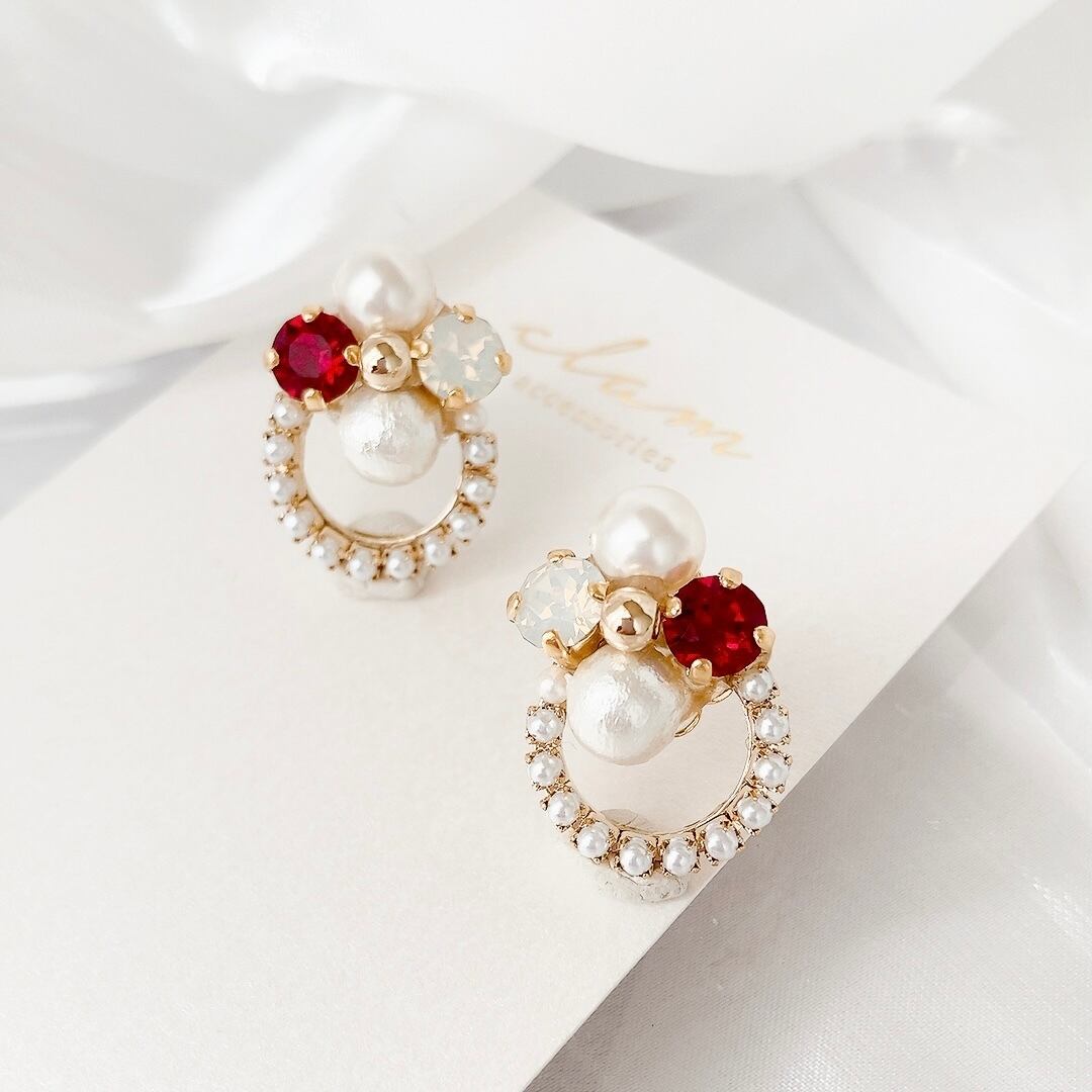 ガーネットカラーと上品なパールが相性抜群のピアス/イヤリングです