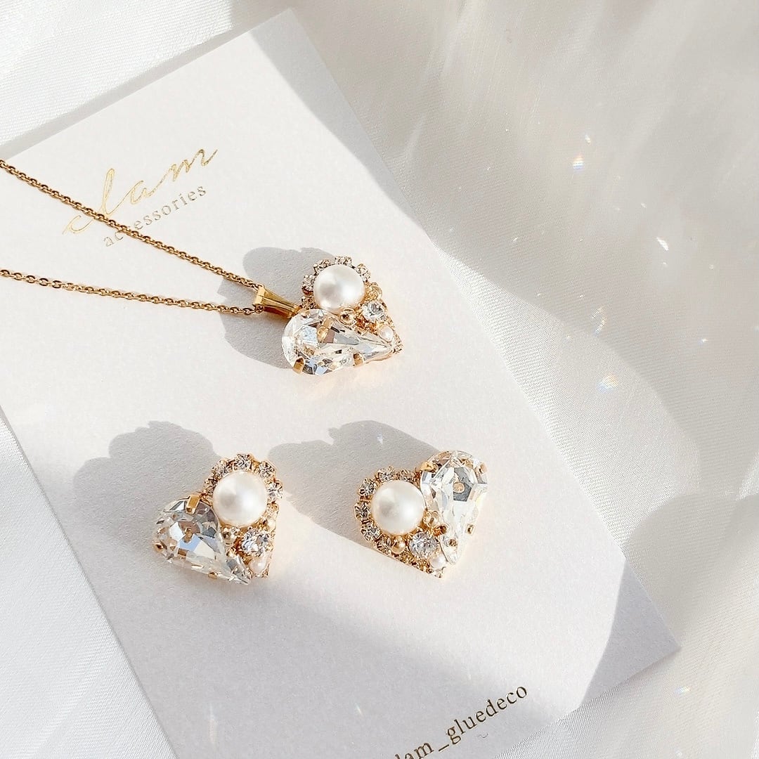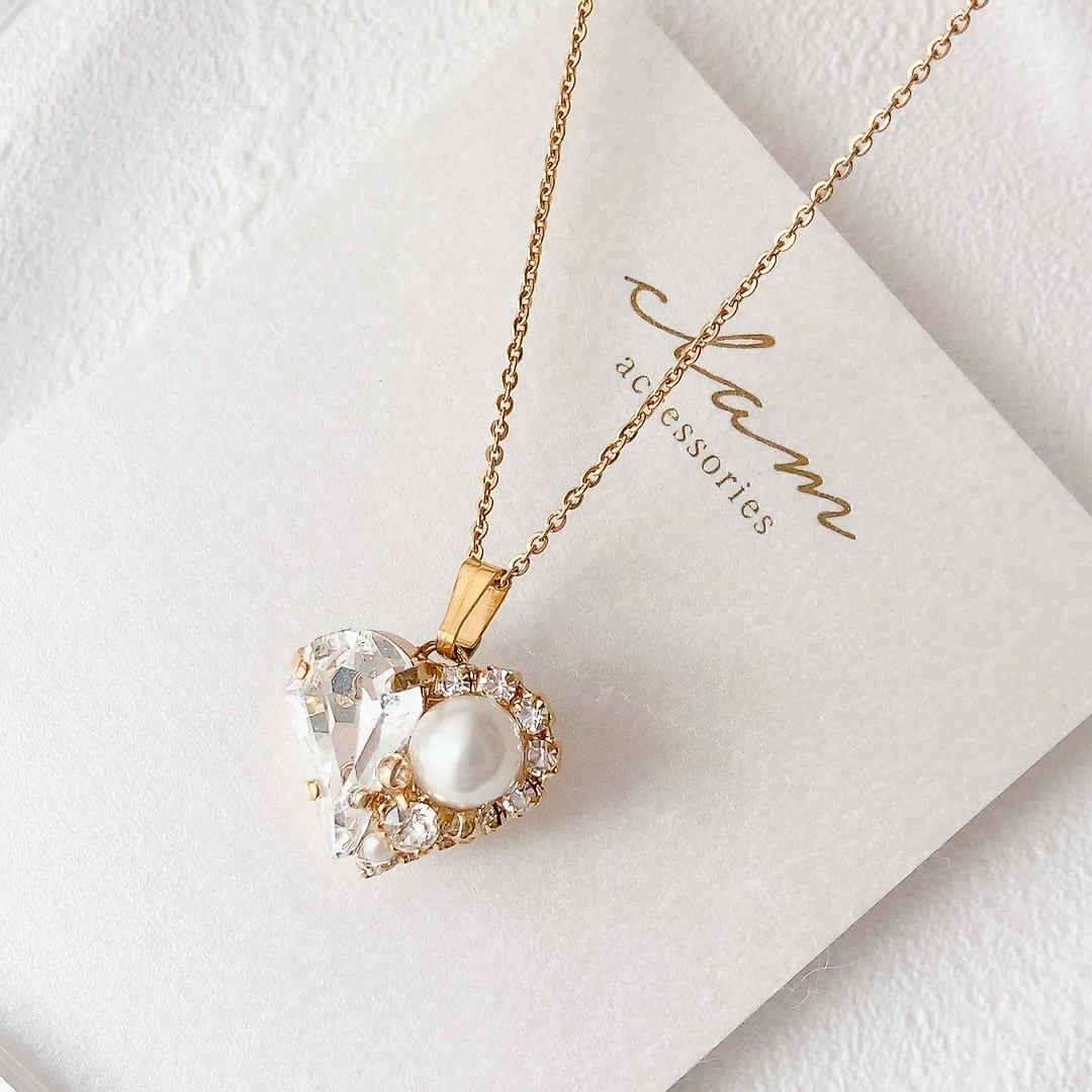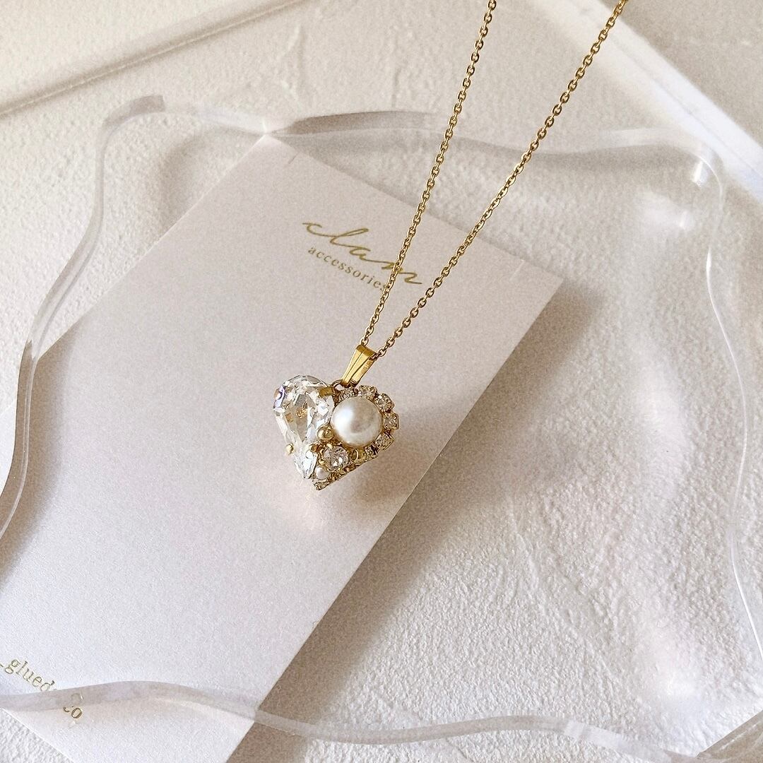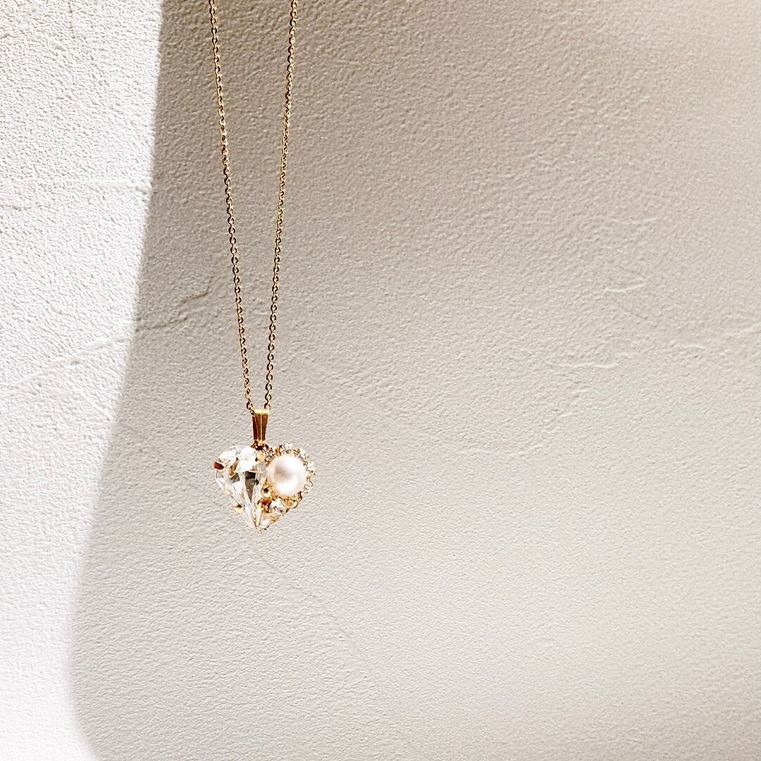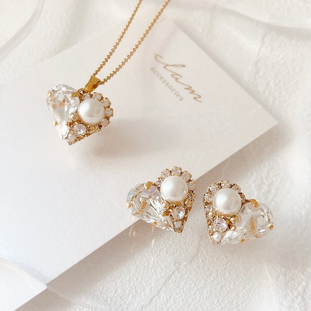 シャープにカットされたクリスタルのハートに、艶やかなパールをひと粒。 甘さを抑えた潔いデザインは、可愛いだけでは物足りない、大人の女性の日常にしっくりと馴染みます。