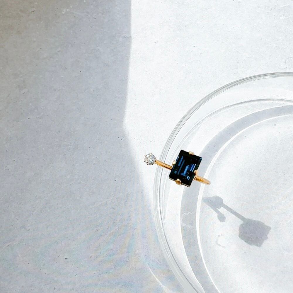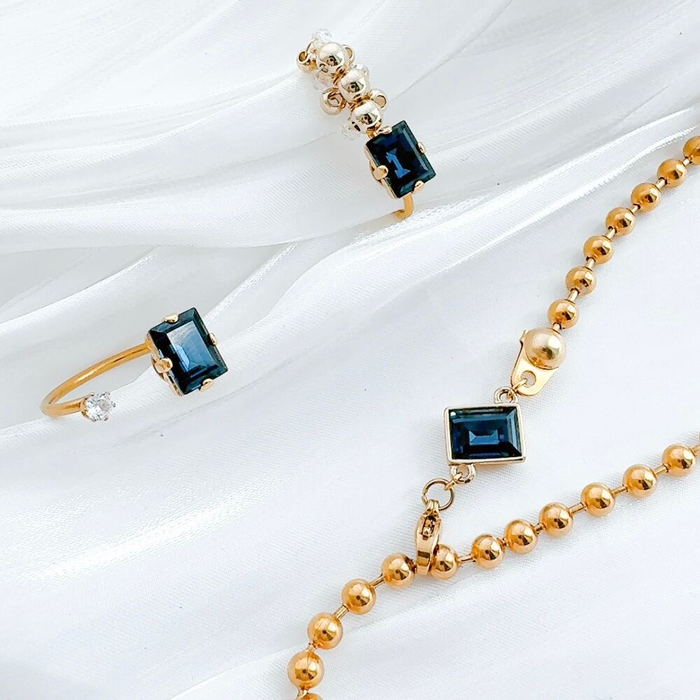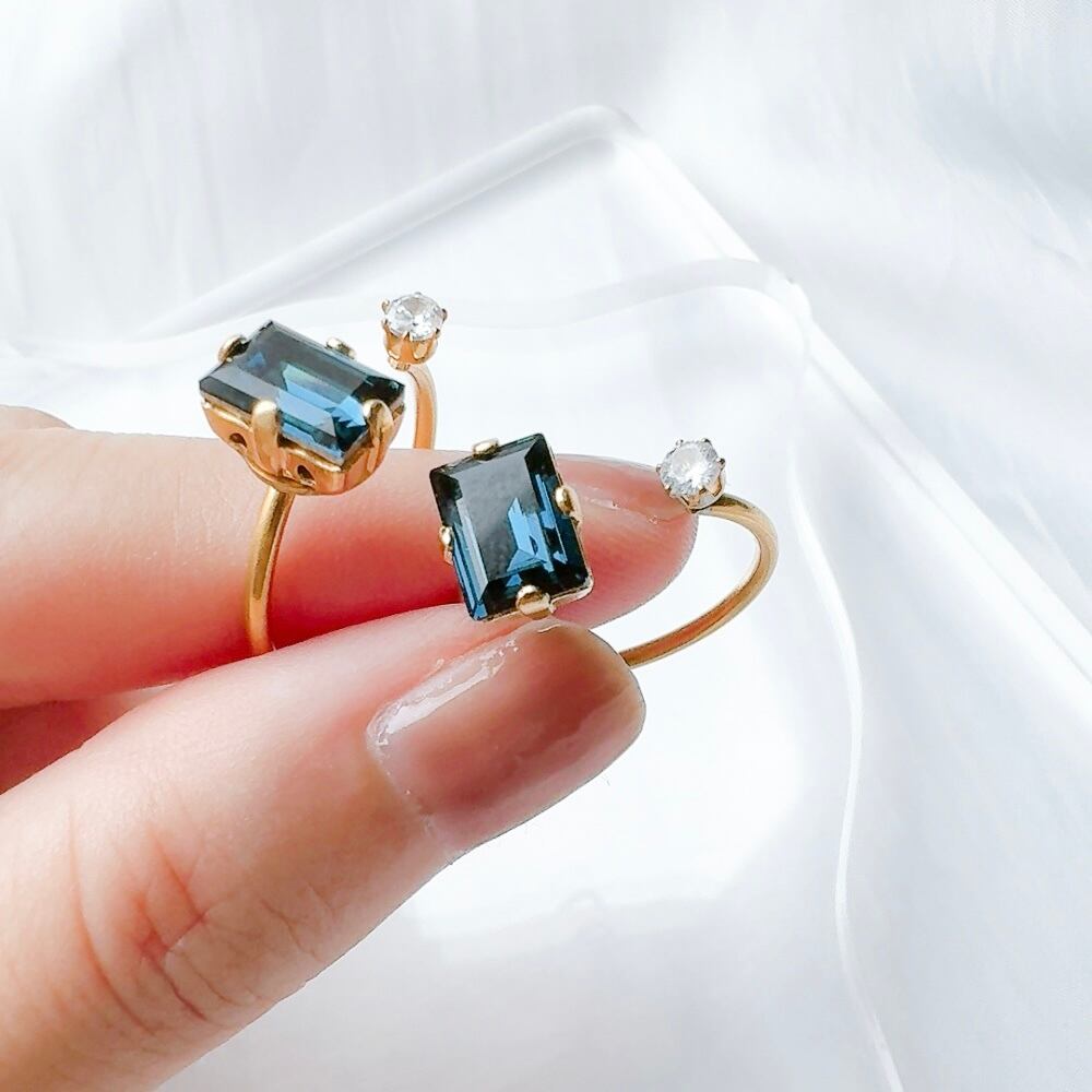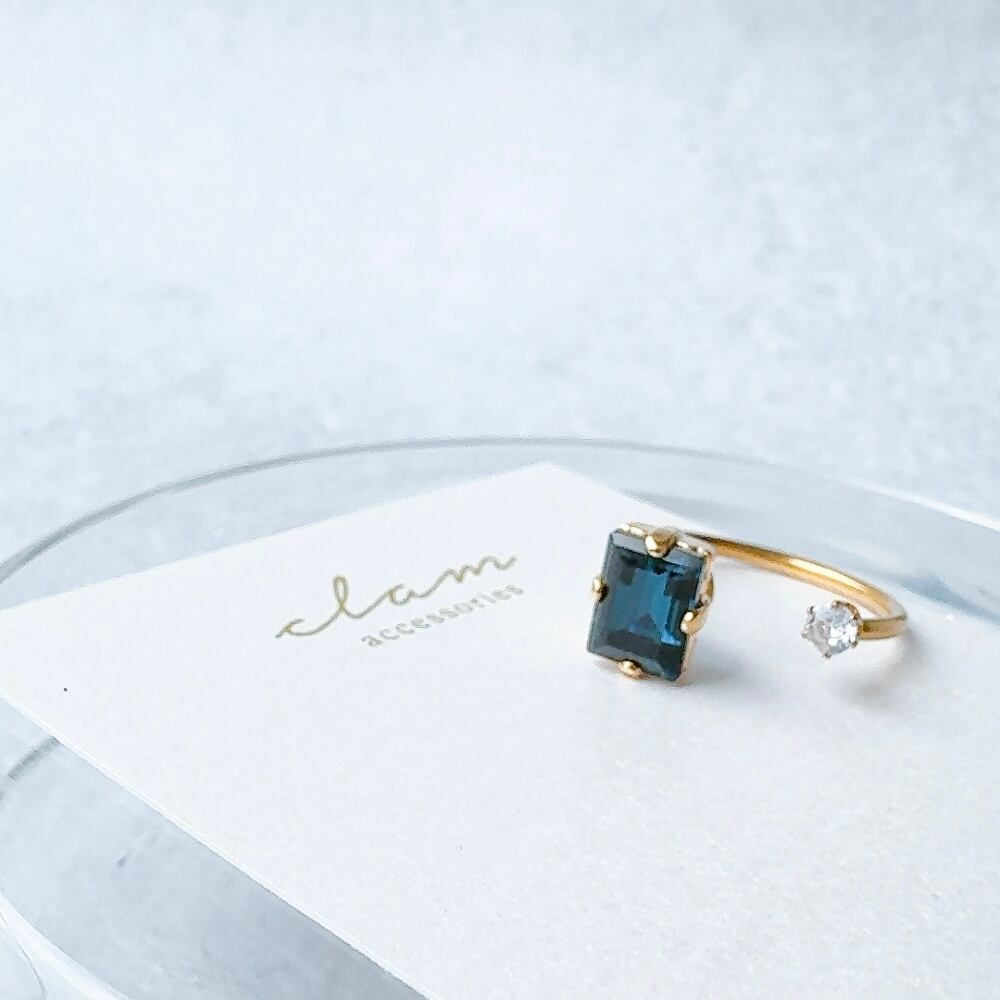 シンプルなリングでありながら、ネイビービジューの輝きがオフィスカジュアルに華を添えます