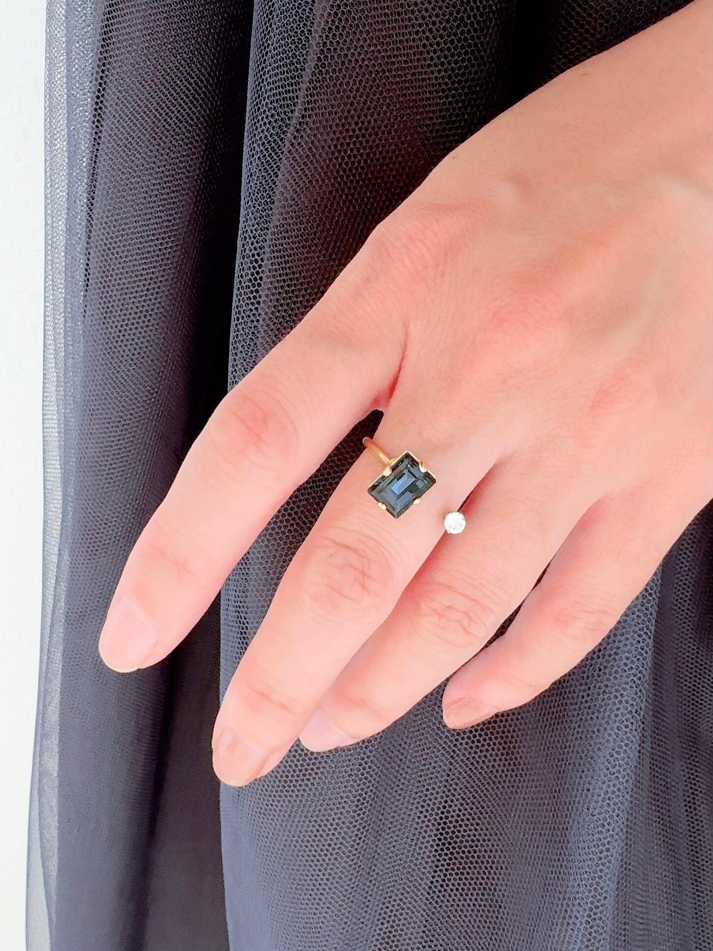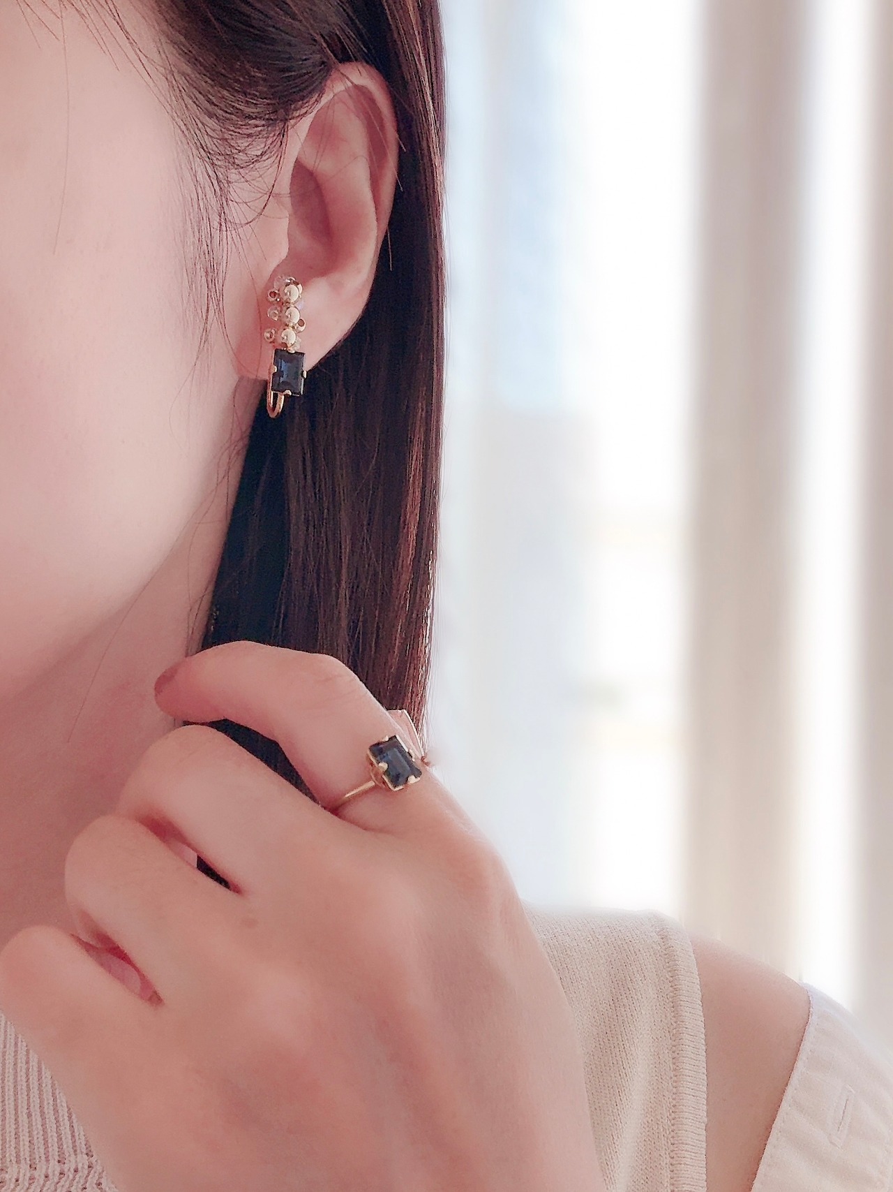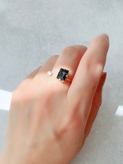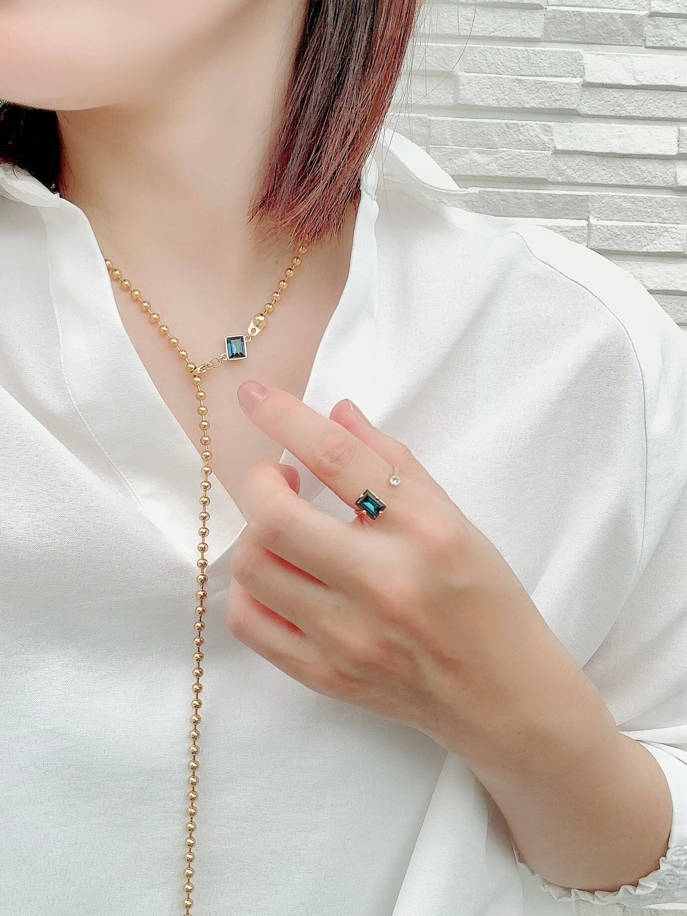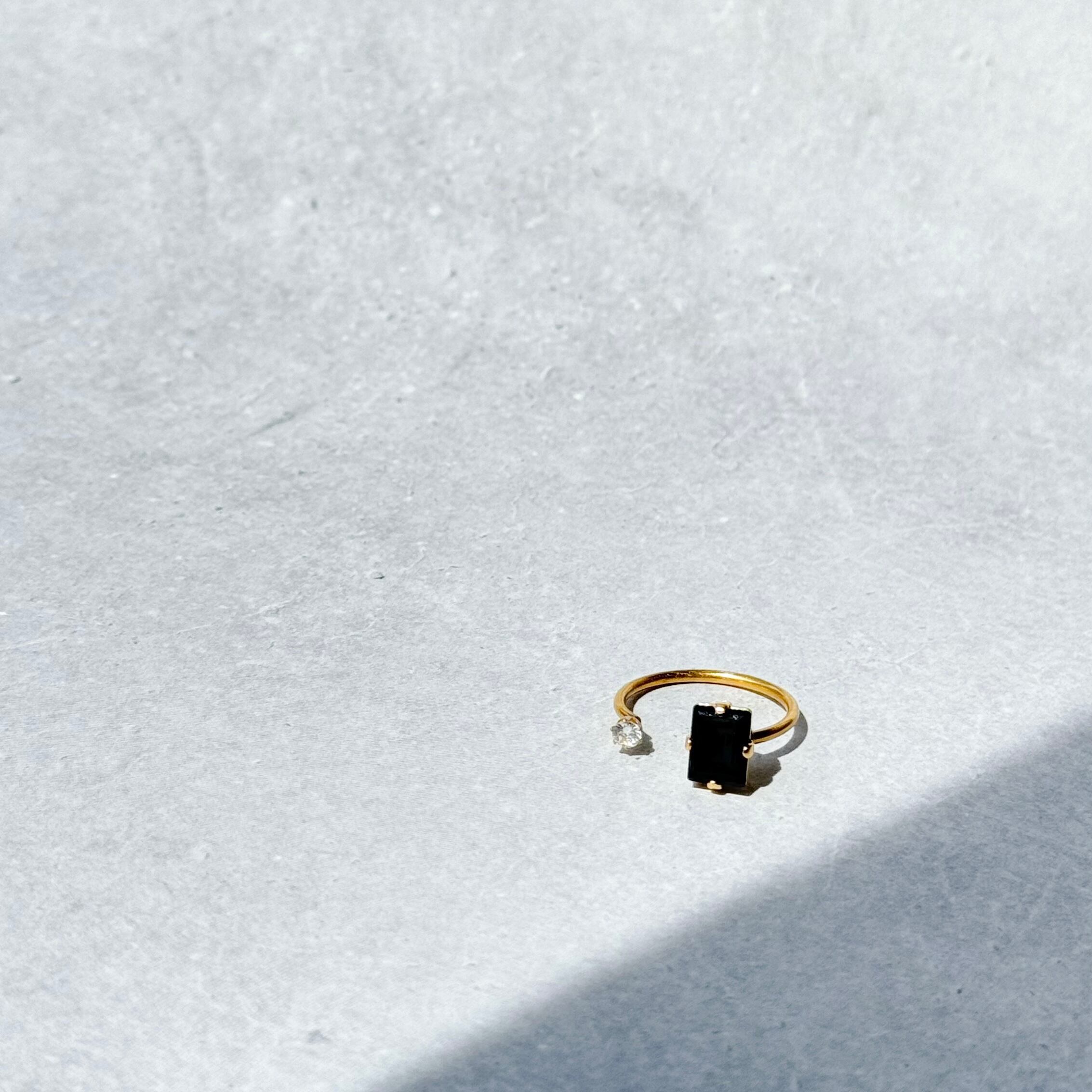 シンプルなリングでありながら、ネイビービジューの輝きがオフィスカジュアルに華を添えます