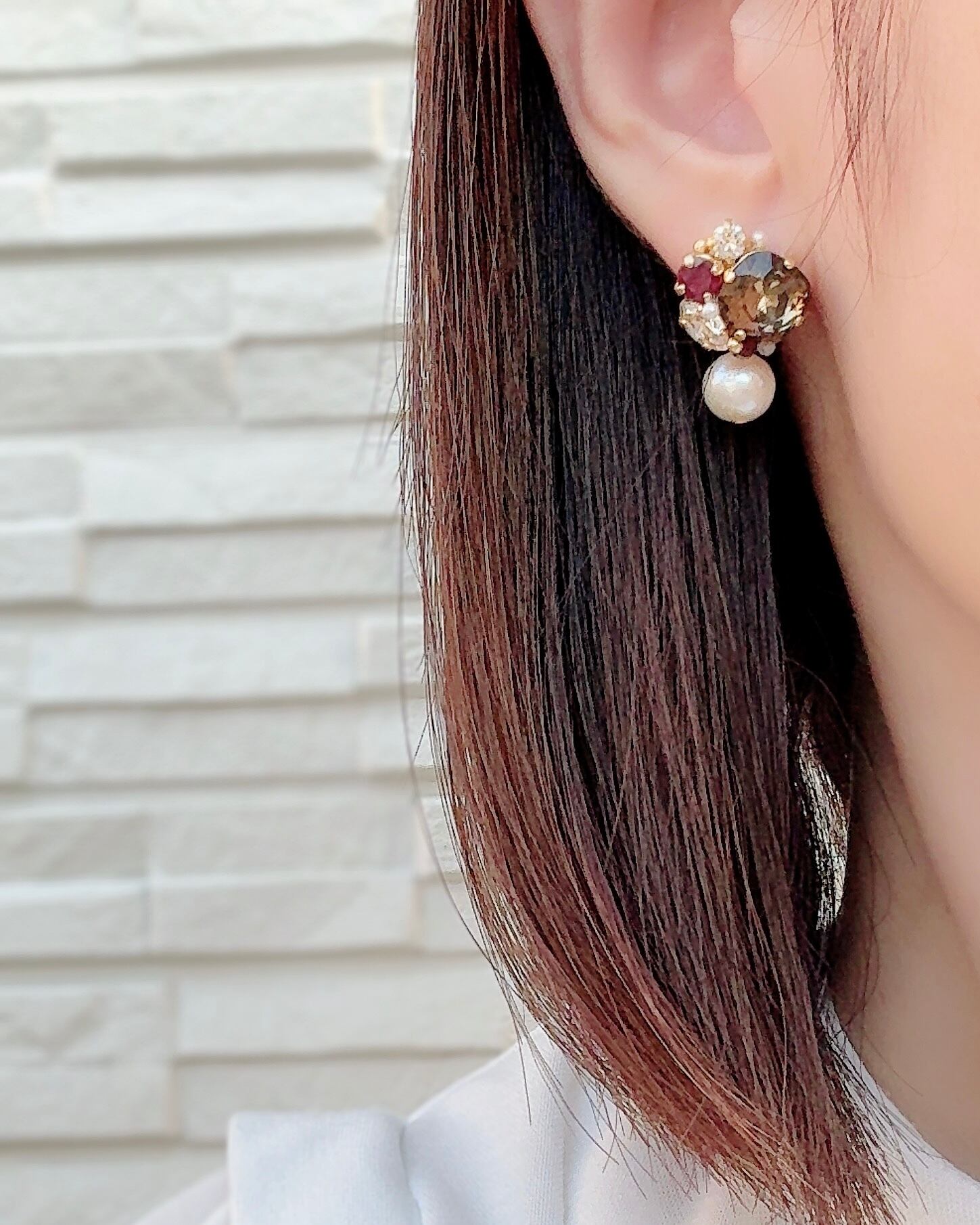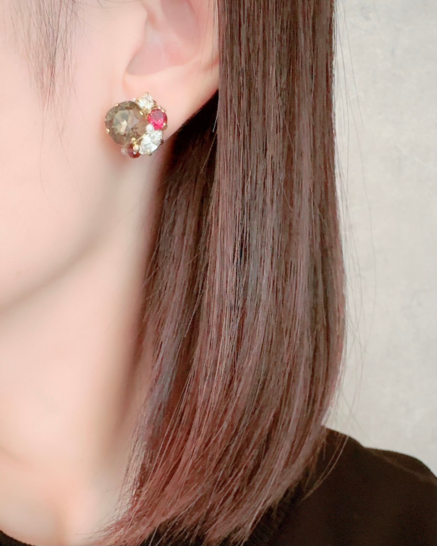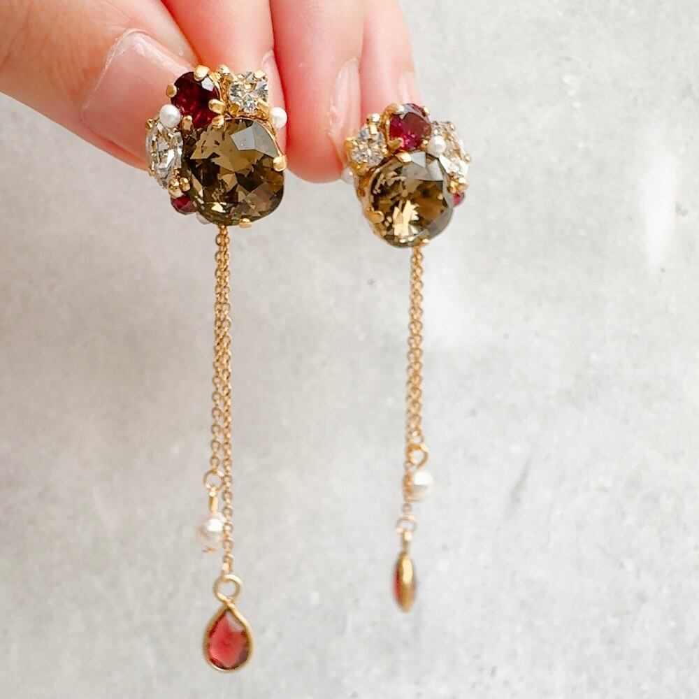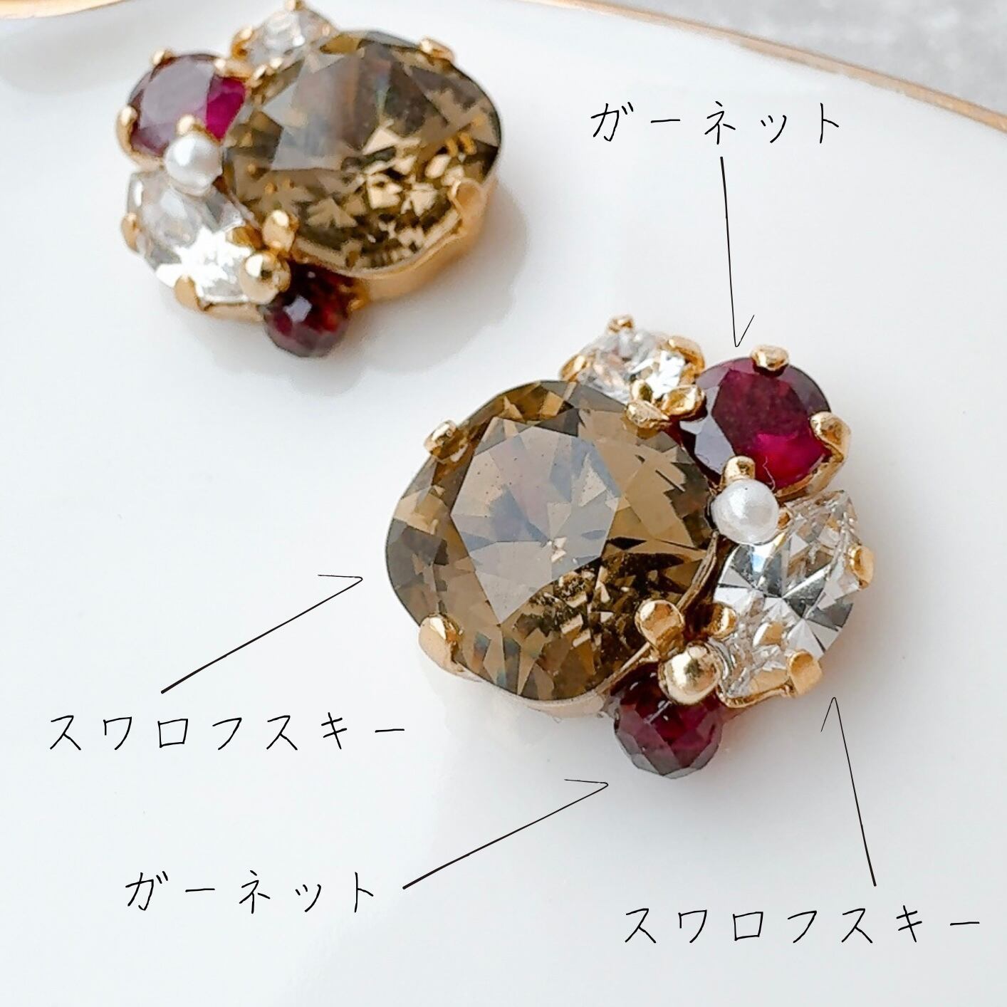 秋の装いにぴったりの、スモーキークォーツカラーのスワロフスキーとガーネットの2way耳飾り