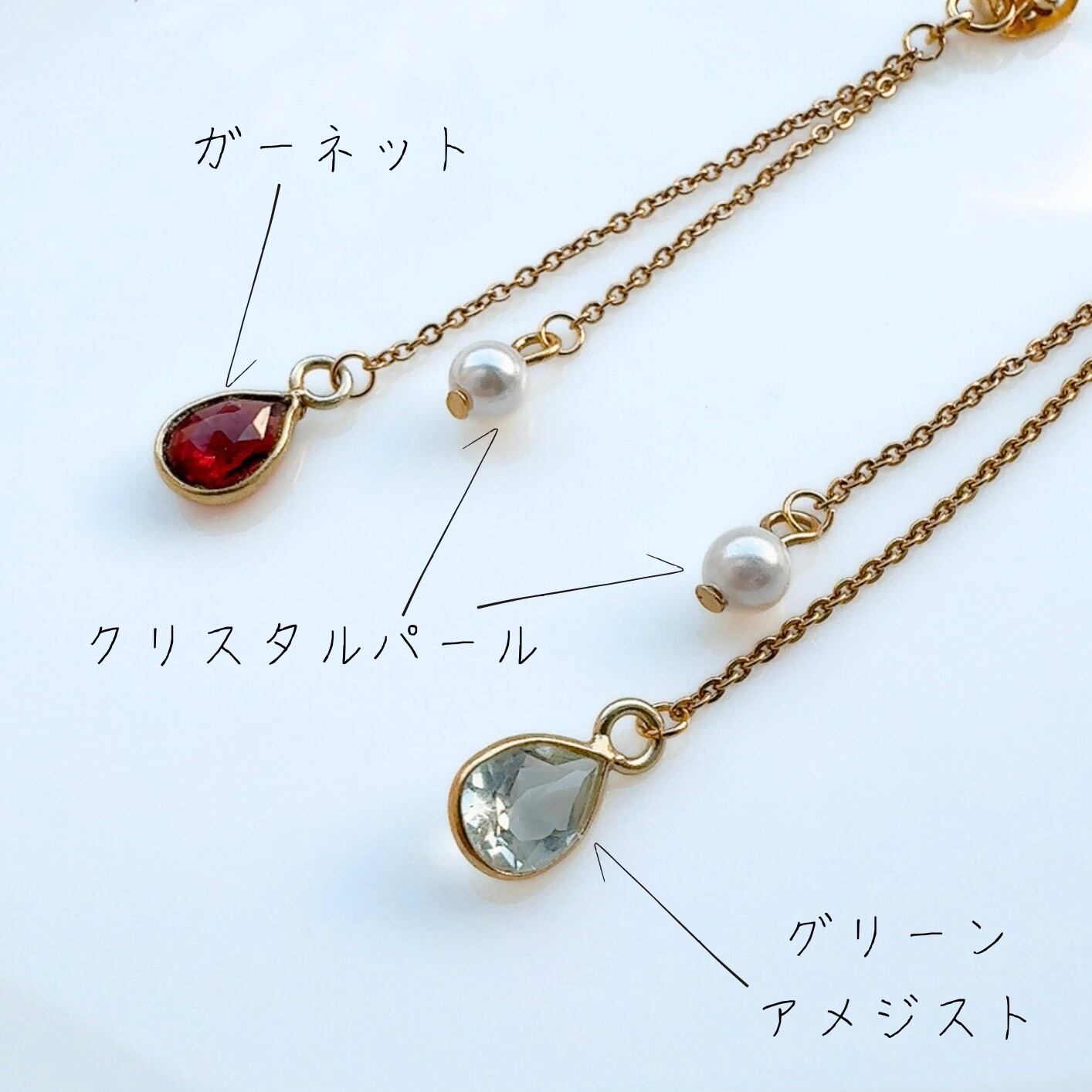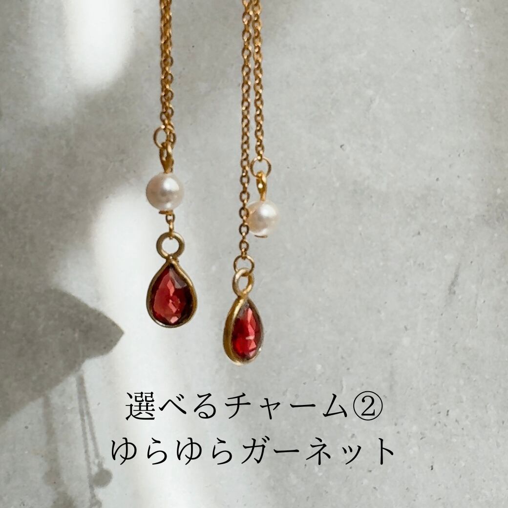 休日のランチや家族とのお出かけには、ガーネットとパールのゆらゆらチャームを加えることで、少しフェミニンなアクセントをプラス。