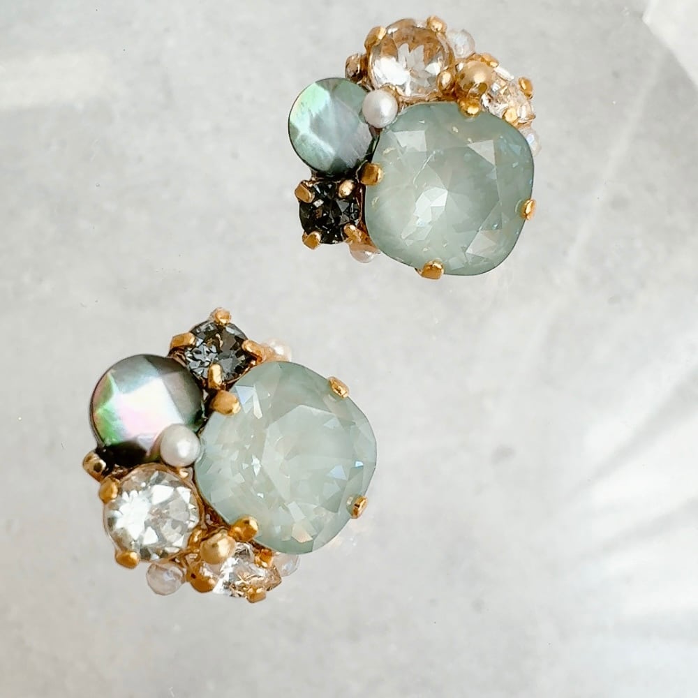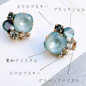 落ち着いたくすみグリーンのスワロフスキーと神秘的なブラックシェルが組み合わさった、洗練された耳飾り。