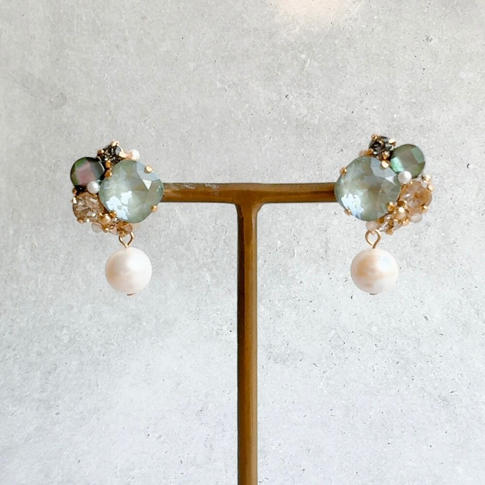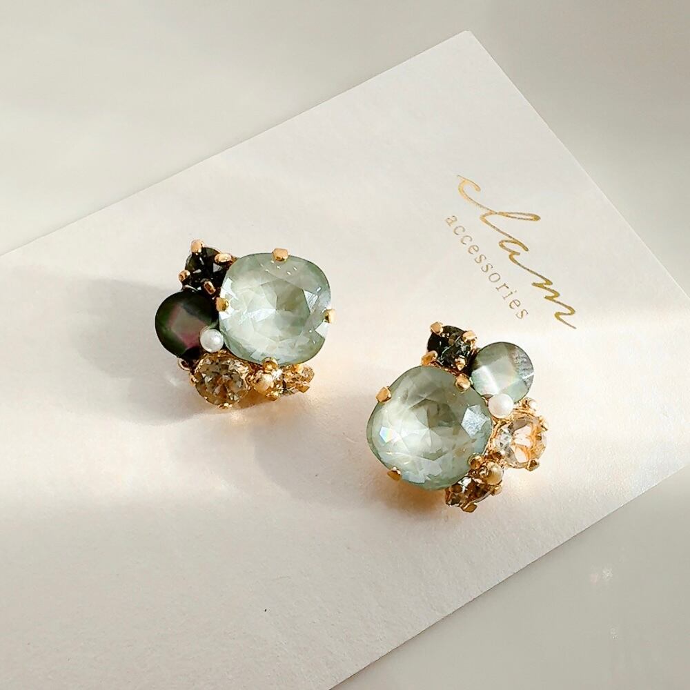 【くすみグリーン×ブラックシェル】ビジューと天然石のピアス/イヤリング
