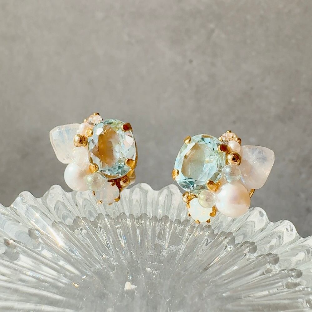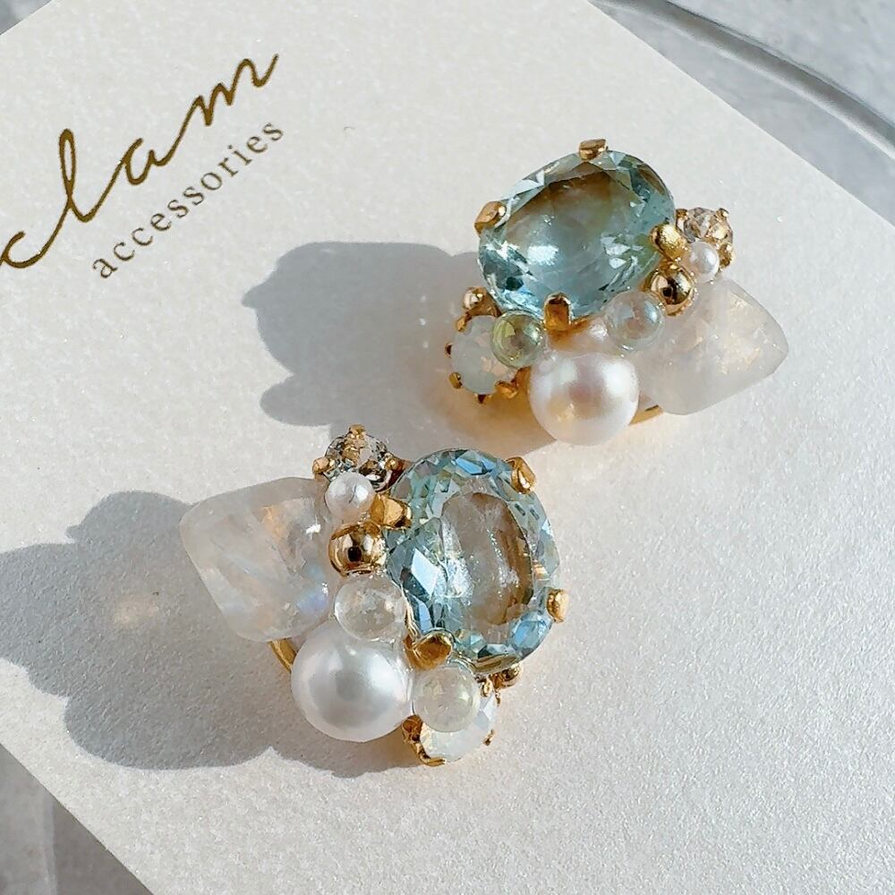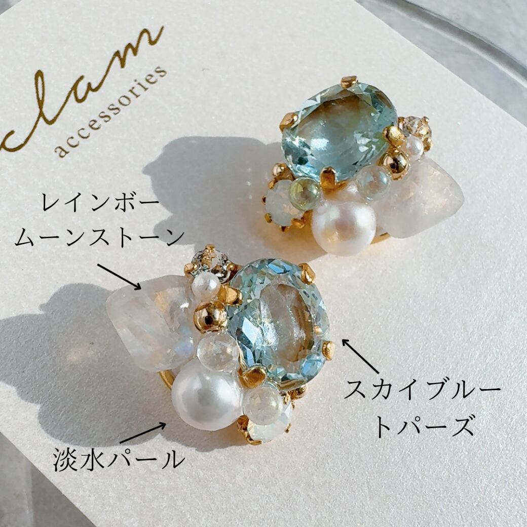 スカイブルートパーズとレインボームーンストーンの耳飾り|澄んだ空を思わせる繊細な輝き